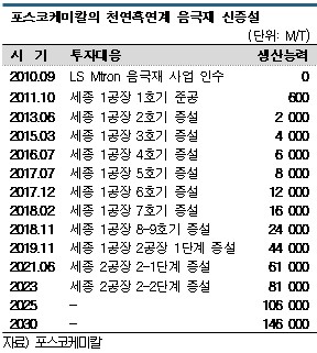 포스코케미칼은 2020년부터 국내 최초로 인조흑연계 음극재 공장 건설에 2177억원 투자를 진행했고 2022년 2월에도 천연흑연 음극재 생산설비 증설을 위해 2711억원 투자를 결정했다.
