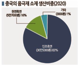 쳰잔산업연구원에 따르면, 중국은 2020년 인조흑연 생산량이 30만5000톤으로 음극재 수요의 83%를 공급했고 천연흑연 생산량은 5만7000
