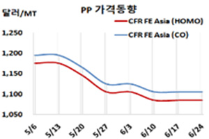 PP(Polypropylene)는 전체적으로 보합세를 형성했다. 아시아 PP 시세는 6월22일 CFR FE Asia 기준 라피아(Raffia) 및 인젝션(Injection) 그레이드가 톤당 1085달러, IPP Film 및 BOPP는 1095달러, 블록 코폴리머(Block Copolymer)는 1105달러로 보합세를 형성했다. 표, 그래프: <PP 가격동향> <화학저널 2022/06/28> |