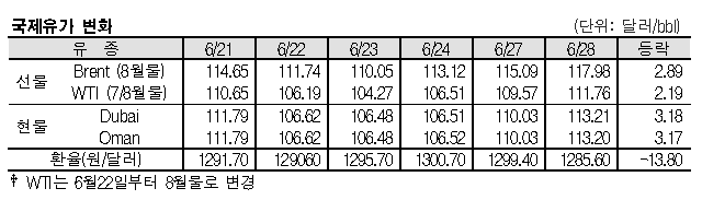 6월27일 국제유가는 공급 부족 우려 영향으로 폭등했다. 프랑스 에마뉘엘 마크롱 대통령은 “사우디와 UAE(아랍에미레이트)의 추가 생산 여력이 거의 없는 것으로 알고 있다”며 “사우디가 추가 생산 가능한 물량은 알려진 잉여 생산능력인 200만배럴보다 훨씬 적은 15만배럴에 불과하며 UAE는 잉여 생산능력이 고갈됐다”고 강조했다. 표, 그래프: <국제유가 변화> <화학저널 2022/06/29> |