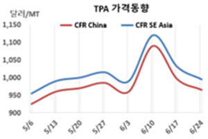 PTA(Purified Terephthalic Acid)는 하락세를 계속했다. PTA 시세는 6월23일 CFR China가 톤당 965달러로 30달러 하락했고 CFR SE Asia 역시 995달러로 35달러 떨어졌다. 표, 그래프: <TPA 가격동향> <화학저널 2022/06/30> |