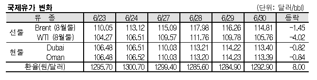6월30일 국제유가는 OPEC(석유수출국기구)+의 증산 계획 유지 영향으로 하락했다. OPEC+는 6월30일 30차 회의를 열고 6월2일의 29차 회의에서 결정한 8월 증산량 64만8000배럴을 유지하기로 결정했다. 표, 그래프: <국제유가 변화> <화학저널 2022/07/01> |