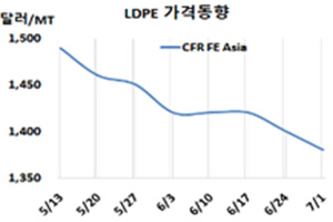 LDPE(Low-Density Polyethylene)는 하락세를 멈추지 못하고 있다. LDPE 시세는 6월29일 CFR FE Asia가 톤당 1380달러로 20달러 하락했고 CFR SE Asia도 1485달러로 20달러 떨어졌다. CFR S Asia 역시 1535달러로 20달러 내려갔다. 표, 그래프: <LDPE 가격동향> <화학저널 2022/07/04> |