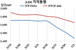 2-EH, CFR China 1270달러로 150달러 폭락 … n-부탄올도 폭락