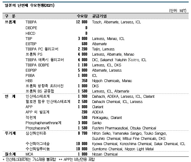 일본은 난연용 수요가 약 1만톤으로 추정된다.