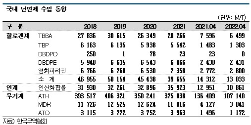2021년 인계 난연제 수입량은 3만5923톤으로 2018년에 비해 12.5% 증가했으나, 2022년 1-4월 수입량은 1만861톤으로 16.1% 감소했다. 중국의 주요 도시 봉쇄가 원인으로 파악된다.