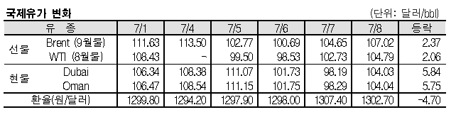 7월8일 국제유가는 글로벌 수요 둔화 우려 완화로 급등했다. 미국 노동부는 6월 비농업부문 신규 고용 건수가 37만2000건 증가했고 실업율은 5월과 같은 3.6%를 기록했으며 시간당 임금도 전월대비 0.3%, 전년동월대비 5.1% 상승했다고 발표했다. 표, 그래프: <국제유가 변화> <화학저널 2022/07/11> |