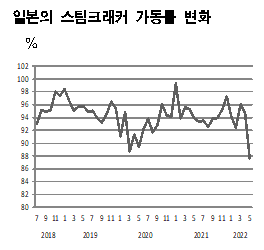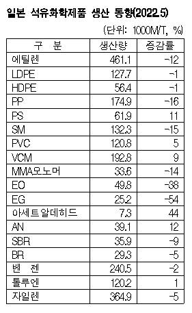 일본이 에틸렌(Ethylene) 감산을 본격화하고 있다. 표, 그래프: <일본의 스팀크래커 가동률 변화>, <일본 석유화학제품 생산 동향(2022.5) <화학저널 2022/07/11> |