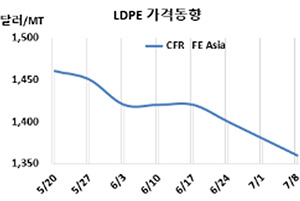 LDPE(Low-Density Polyethylene)는 하락세를 멈추지 못하고 있다. LDPE 시세는 7월6일 CFR FE Asia가 톤당 1360달러로 20달러 하락했으나 CFR SE Asia는 1485달러로 변동이 없었다. CFR S Asia는 1515달러로 20달러 떨어졌다. 표, 그래프: <LDPE 가격동향> <화학저널 2022/07/11> |