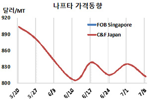 나프타(Naphtha)는 800달러가 무너질 조짐이다. 나프타 시세는 7월7일 C&F Japan 톤당 812달러로 23달러 하락했고 FOB Singapore 역시 812달러로 23달러 떨어졌다. 표, 그래프: <Naphtha 가격동향> <화학저널 2022/07/11> |