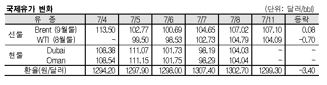7월11일 국제유가는 러시아산 원유 공급 감소 우려로 상승했다. 미국 등 서방 국가들이 러시아산 원유 가격상한제를 논의함에 따라 러시아가 공급을 줄여 에너지 무기화에 나설 가능성이 제기되고 있다. 표, 그래프: <국제유가 변화> <화학저널 2022/07/12> |