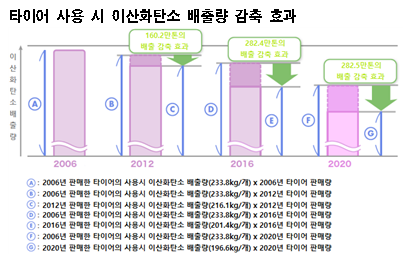 저연비 타이어는 이산화탄소(CO2) 배출량 감축에 기여할 것으로 예상된다. 표, 그래프: <타이어 사용 시 이산화탄소 배출량 감축 효과> <화학저널 2022/07/12> |
