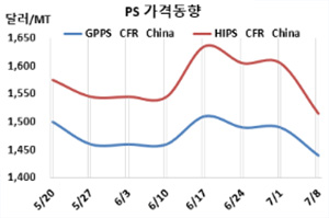 PS(Polystyrene)는 전자용이 크게 떨어졌다. GPPS(General Purpose PS) 시세는 7월6일 CFR China가 1440달러로 50달러, CFR SE Asia는 1525달러로 60달러 폭락했다. CFR India도 1680달러로 50달러 떨어졌다. 표, 그래프: <PS 가격동향> <화학저널 2022/07/13> |