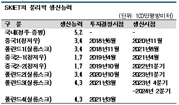 SK이노베이션의 자회사 SKIET(SK아이이테크놀로지)는 증평과 중국 창저우, 폴란드 실롱스크에서 분리막 총 13억7000만평방미터 생산능력을 보유하고 있다.