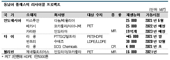 다만, 인도네시아와 타이가 병(Bottle)용 PET(Polyethylene Terephthalate), 포장용 폴리올레핀(Polyolefin) 리사이클 공장을 건설하고 있으나, 폐플래스틱 회수망 안정화나 지역사회와의 협력 강화 등이 요구되고 있다.