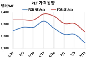 PET(Polyethylene Terephthalate)는 폭락세로 돌변했다. 병(Bottle) 그레이드 PET 시세는 7월13일 FOB NE Asia가 1145달러로 70달러 폭락했고 FOB SE Asia도 1235달러로 70달러 폭락했다. CFR S Asia는 1340달러로 50달러 급락했다. 표, 그래프: <PET 가격동향> <화학저널 2022/07/21> |