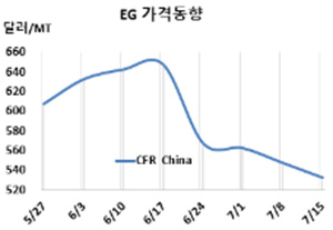 MEG(Monoethylene Glycol)는 대폭락 이후에도 하락세를 멈추지 못하고 있다. MEG 시세는 7월14일 CFR China가 톤당 533달러로 15달러 하락했고 CFR SE Asia도 543달러로 15달러 떨어졌다. 표, 그래프: <EG 가격동향> <화학저널 2022/07/21> |