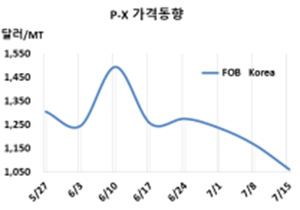 P-X 시세는 7월14일 FOB Korea가 톤당 1060달러로 105달러 폭락했으나 CFR SE Asia는 1185달러로 10달러 하락에 그쳤다. CFR China는 1060달러로 105달러, CFR Taiwan도 1080달러로 105달러 폭락했다.