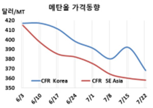 표, 그래프: <Methanol 가격동향> <화학저널 2022/07/26> |