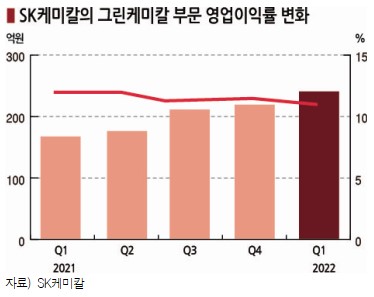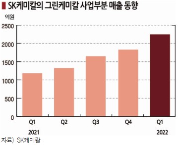 SK케미칼은 2022년 1분기 연결 기준 매출액이 4181억원으로 전년동기대비 12.1% 증가했으나 영업이익은 487억원으로 40.5% 급감했다. SK바이오사이언스가 부진했기 때문으로, 그린케미칼 사업은 코폴리에스터 신규 라인 100% 가동과 수요 증가에 따라 매출액이 2110억원으로 52.0%, 영업이익은 267억원으로 41.0% 급증했고 매출액과 영업이익이 5분기 연속 증가했다.