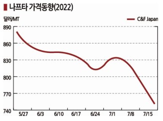 나프타는 6월30일 C&F Japan 톤당 835달러를 형성한 가운데 국제유가가 브렌트유(Brent) 기준 배럴당 110달러대에서 등락하고 있어 추가 상승할 가능성이 제기됐으나 7월 중순 700달러대 중반으로 폭락했다.