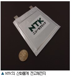 일본특수도업(NGK)은 산화물계로 용량 0.5-10Wh에 크기 30-110mm 사양 전고체전지 출시를 앞두고 있다.
