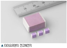 타이요유덴은 MLCC 제조공법을 활용해 전고체전지를 생산하고 있으며 대형부터 1mm 이하 초소형까지 칩 형태로 공급이 가능한 것으로 알려졌다.