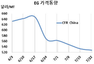 MEG(Monoethylene Glycol)는 대폭락 이후에도 하락세가 계속되고 있다. MEG 시세는 7월21일 CFR China가 톤당 528달러로 5달러 하락했고 CFR SE Asia도 538달러로 역시 5달러 떨어졌다. 표, 그래프: <EG 가격동향> <화학저널 2022/07/27> |
