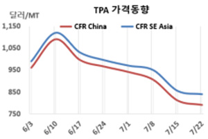 PTA(Purified Terephthalic Acid)는 초강세의 후유증이 커지고 있다. PTA 시세는 7월21일 CFR China가 톤당 790달러로 20달러 하락했고 CFR SE Asia도 840달러로 15달러 떨어졌다. 표, 그래프: <TPA 가격동향> <화학저널 2022/07/27> |