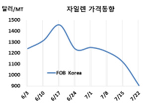 표, 그래프: <자일렌 가격동향> <화학저널 2022/07/27> |