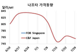 나프타 시세는 7월28일 C&F Japan 톤당 761달러로 8달러 하락했고 FOB Singapore 역시 761달러로 8달러 떨어졌다.