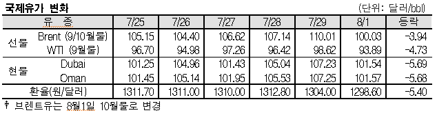 8월1일 국제유가는 글로벌 제조업 지수 약세로 인한 경기침체 우려와 리비아 생산량 회복 등으로 폭락했다.