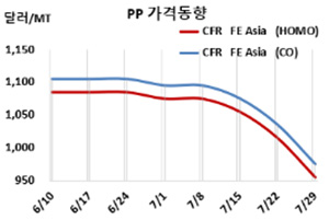 PP(Polypropylene)는 폭락세가 가팔라지고 있다. 아시아 PP 시세는 7월27일 CFR FE Asia 기준 라피아(Raffia) 및 인젝션(Injection) 그레이드가 톤당 955달러, IPP Film 및 BOPP는 965달러, 블록 코폴리머(Block Copolymer)는 975달러로 각각 60달러 폭락했다. 표, 그래프: <PP 가격동향> <화학저널 2022/08/02> |