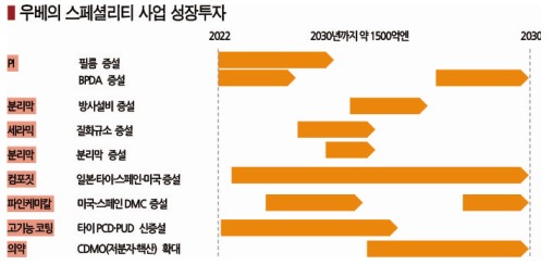 우베(Ube)가 2030년까지 스페셜리티 화학 사업에 1500억엔을 투자함으로써 2030년 전체 영업이익의 70% 이상을 스페셜리티에서 창출함은 물론 매출액 대비 영업이익률(ROS) 10% 이상을 달성할 계획이다.
