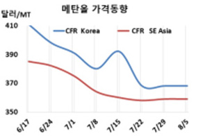 메탄올 시세는 8월4일 CFR Korea가 톤당 368달러로 보합세를 형성했고 CFR SE Asia도 359달러로 변동이 없었다. CFR Taiwan 역시 363달러를 유지했으나 CFR China는 306달러로 3달러 하락했다.