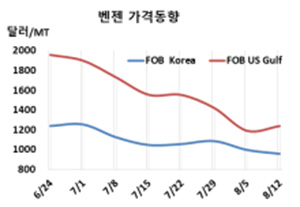 표, 그래프: <Benzene 가격동향> <화학저널 2022/08/18> |