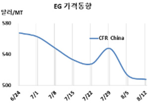 MEG(Monoethylene Glycol)는 반등에 실패했다. MEG 시세는 8월11일 CFR China가 톤당 508달러로 5달러 하락했고 CFR SE Asia도 518달러로 5달러 내려갔다. 표, 그래프: <EG 가격동향> <화학저널 2022/08/19> |