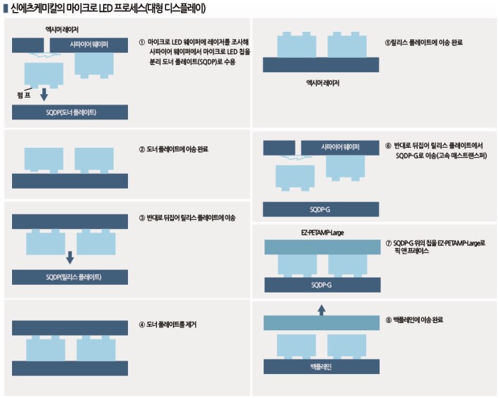 신에츠케미칼은 마이크로 LED 디스플레이 제조공정 가운데 웨이퍼에 형성된 수십마이크로미터대 미세 LED 칩(마이크로 LED 칩)을 회로기판(백플레인)에 이송‧전사하는 중간공정을 표준화하는 것을 목표로 하고 있다.