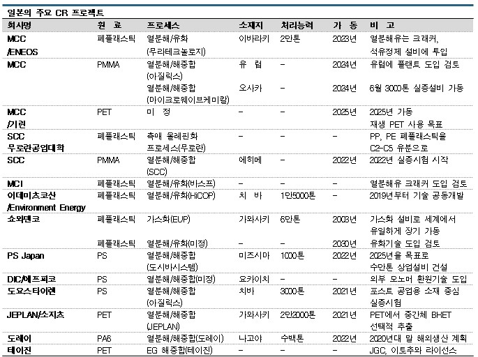 미츠비시케미칼은 2021년 7월 말 에네오스와 공동으로 이바라키(Ibaraki) 공장에 수십억엔을 투입해 CR 사업을 시작하기로 결정했다.