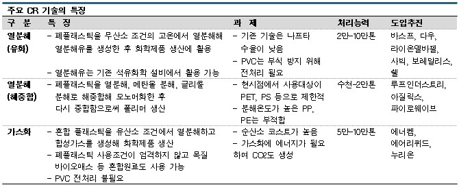 유화기술은 폐플래스틱, 폐타이어 등을 산소가 없는 환경에서 고온으로 열분해해 유화, 나프타(Naphtha), 중질유를 얻는 프로세스로 설비 건설에 많은 비용이 소요되나 기존 석유화학 설비를 활용해 다양한 화학제품에 부가가치를 부여할 수 있어 가장 유력한 CR 기술로 주목받고 있다.