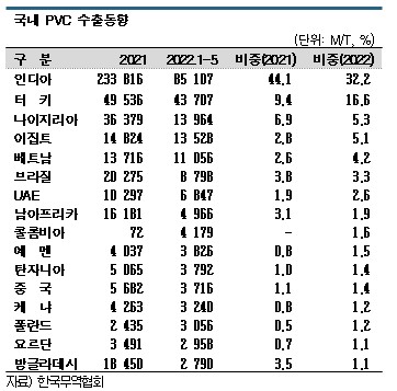 한국무역협회에 따르면, 국내 PVC 수출에서도 인디아가 큰 비중을 차지하고 있으나 2022년 5월 수출량은 8035톤으로 1월에 비해 67.2% 급감했다. 한국산은 인디아 수출가격이 5월 톤당 1299달러로 1300달러를 하회한 것으로 나타났다.