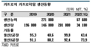 하지만, 2022년 1분기 카프로락탐 생산량은 생산능력의 50.4%인 3만4000톤에 불과했으며 평균 가동률은 2공장 43.4%, 3공장 73.9%에 불과했다.