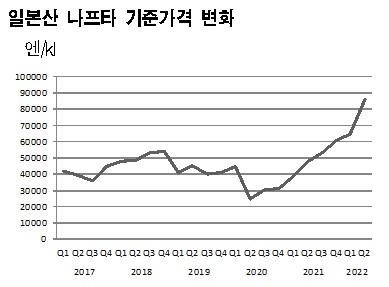 일본은 나프타(Naphtha) 가격이 폭등해 수익성 악화가 심화되고 있다. 표, 그래프: <일본산 나프타 기준가격 변화> <화학저널 2022/08/29> |