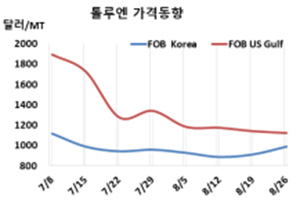 표, 그래프: <톨루엔 가격동향> <화학저널 2022/08/31> |
