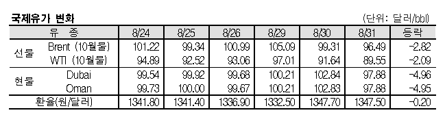 8월31일 국제유가는 중국의 경제 활동 둔화 영향으로 폭락했다. 중국은 제로 코로나 정책 및 가뭄·폭염으로 경제 활동이 둔화됐다. 표, 그래프: <국제유가 변화> <화학저널 2022/09/01> |
