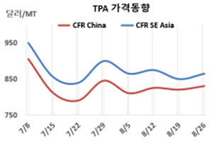 PTA(Purified Terephthalic Acid)는 소폭 상승했다. PTA 시세는 8월25일 CFR China가 톤당 830달러로 10달러 상승했고 CFR SE Asia도 865달러로 15달러 올랐다. 표, 그래프: <TPA 가격동향> <화학저널 2022/09/01> |