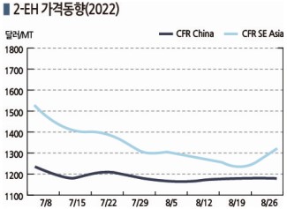 2-EH 현물가격은 8월25일 CFR China가 톤당 1145달러, CFR SE Asia는 1200달러로 약보합세를 계속했다.