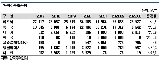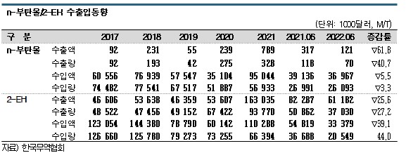 원화환율 상승과 운송비 부담 등으로 2022년 상반기에는 n-부탄올 수입량이 2만6093톤으로 3.3% 감소했고, 2-EH는 2만549톤으로 44.0% 급감했다. 2-EH는 수출량 역시 3만7030톤으로 27.2% 줄어들었다.