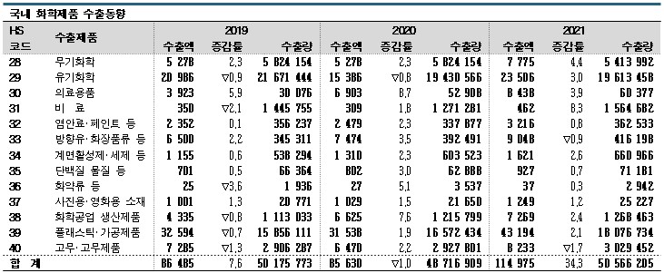 HS코드 28-40번대 화학제품 수출액은 1149억7500만달러로 34.3%, 수입액은 733억1200만달러로 28.2% 늘어나 전체 무역총액이 1882억8700만달러로 31.8% 급증했다. 수출액은 방향유, 향료, 화장품류, 고무 및 고무제품 외에 전부, 수입액은 화약류 외에 전부 증가했다.
