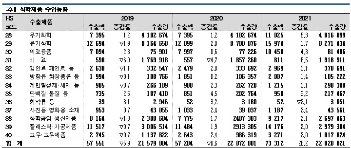 2021년과 마찬가지로 화학제품 수요가 호조하고 원료가격이 강세를 나타내면서 가격 전가가 빠르게 이루어지고 있어 수출입액이 증가할 가능성이 큰 것으로 파악된다.